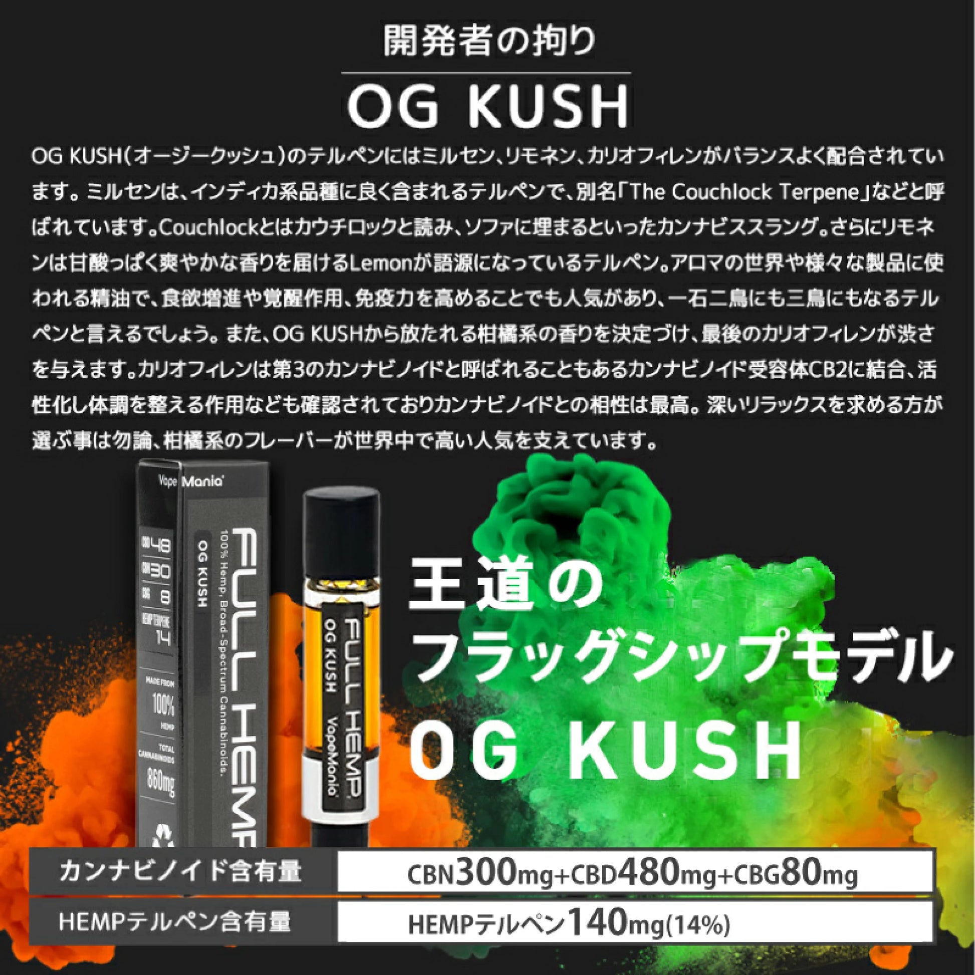 OG KUSH(オージークッシュ)のテルペンにはミルセン、リモネン、カリオフィレンがバランスよく配合されています。 ミルセンは、インディカ系品種に良く含まれるテルペンで、別名「The Couchlock Terpene」などと呼ばれています。Couchlockとはカウチロックと読み、ソファに埋まるといったカンナビススラング。さらにリモネンは甘酸っぱく爽やかな香りを届けるLemonが語源になっているテルペン。アロマの世界や様々な製品に使われる精油で、食欲増進や覚醒作用、免疫力を高めることでも人気があり、一石二鳥にも三鳥にもなるテルペンと言えるでしょう。 また、OG KUSHから放たれる柑橘系の香りを決定づけ、最後のカリオフィレンが渋さを与えます。カリオフィレンは第3のカンナビノイドと呼ばれることもあるカンナビノイド受容体CB2に結合、活性化し体調を整える作用なども確認されておりカンナビノイドとの相性は最高。 深いリラックスを求める方が選ぶ事は勿論、柑橘系のフレーバーが世界中で高い人気を支えています。