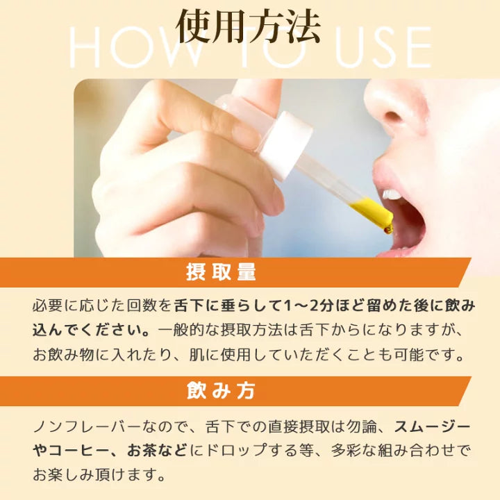 ノンフレーバーなので、舌下での直接摂取は勿論、スムージーやコーヒー、お茶などにドロップする等、多彩な組み合わせでお楽しみ頂けます。