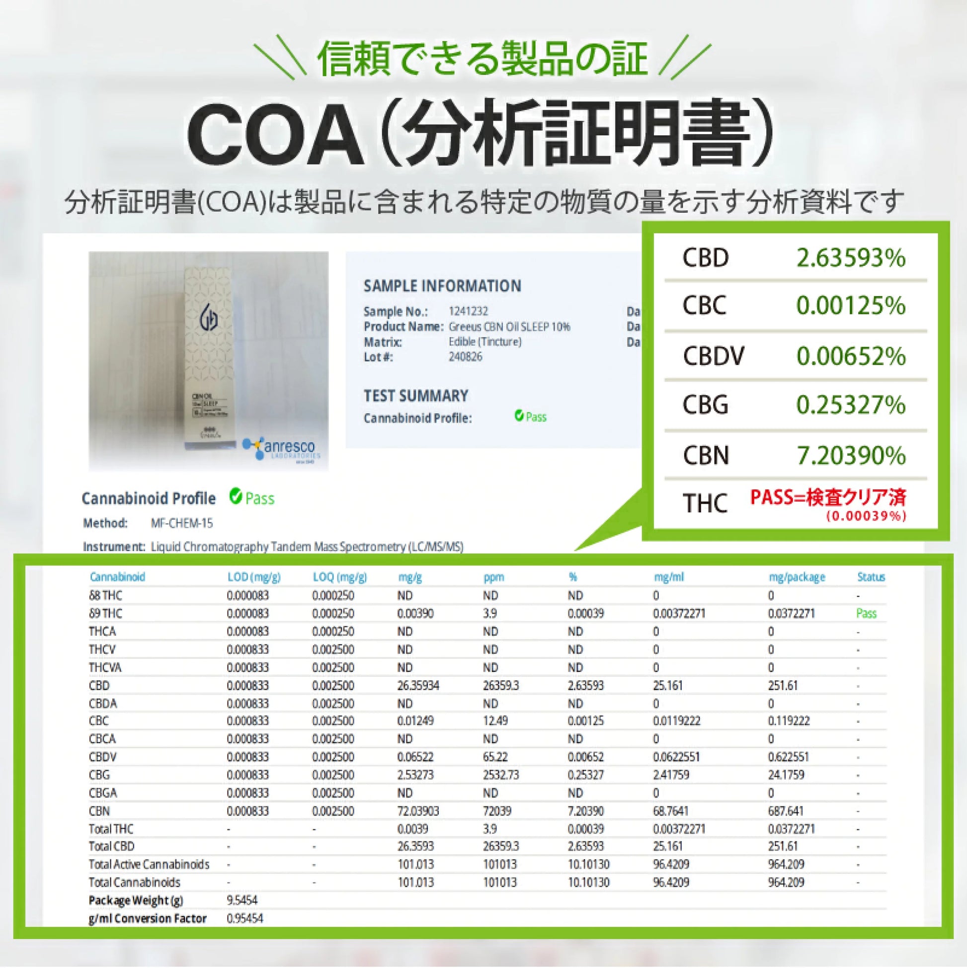 スイス国認定ヘンプのアイソレートCBNとディスティレートCBDが配合されています。