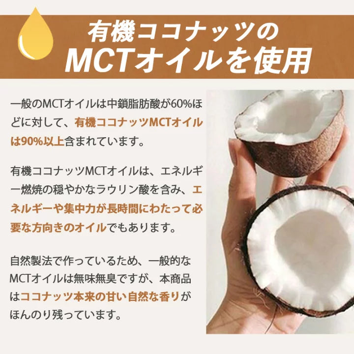 植物油のなかで中鎖脂肪酸を多く含むのは、ココナッツオイルやパーム(アブラヤシ)の種の中にある核を原料としたパーム核油など、ヤシ科の植物油だけ。一般のMCTオイルは中鎖脂肪酸が60%ほどに対して、有機ココナッツMCTオイルは90%以上含まれおります。また、一般のココナッツオイルは20度以下で固体化するが、有機ココナッツMCTオイルは5度以下まで液体の状態を保ちます。本商品は有機エキストラバージンココナッツオイルを加熱することなく徐々に温度を下げ、固まる脂肪酸を取り除く“非加熱”自然製法でオイルに負荷をかけずにMCTの割合約90%以上を実現。有機ココナッツMCTオイルは、エネルギー燃焼の穏やかなラウリン酸を含み、エネルギーや集中力が長時間にわたって必要な方向きのオイルでもあります。自然製法で作っているため、一般的なMCTオイルは無味無臭ですが、本商品はココナッツ本来の甘い自然な香りがほんのり残っております。