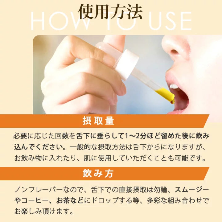 ノンフレーバーなので、舌下での直接摂取は勿論、スムージーやコーヒー、お茶などにドロップする等、多彩な組み合わせでお楽しみ頂けます。