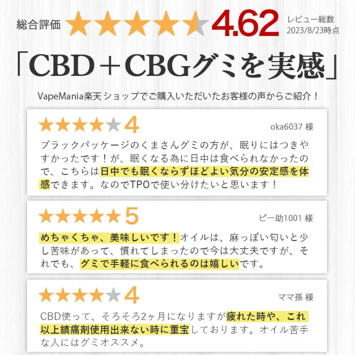 ※ グミはすぐに飲み込まず、舌下等にしばらくとどめて摂取頂きますとよりカンナビノイドの吸収が良くなります。