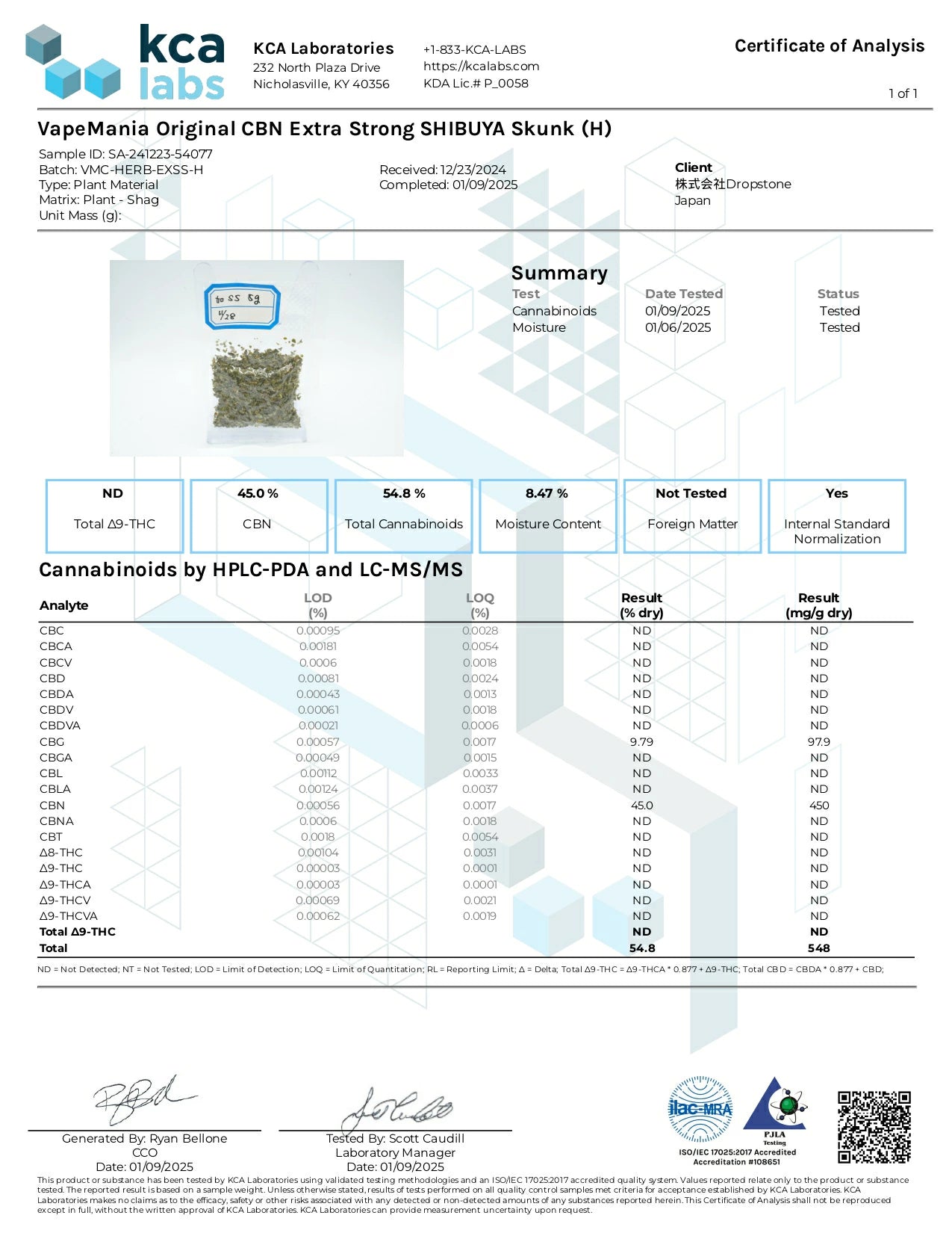 CBN + CBG + HEMPテルペンで出来た、エクストラストロングのCBNハーブが登場。その名も「CBNハーブ Extra Strong」SHIBUYA SKUNKです。今益々注目が高まっているCBNを含有。さらに、CBGやHEMPテルペンも配合し、これまで最も芳醇な仕上がりとなっております。